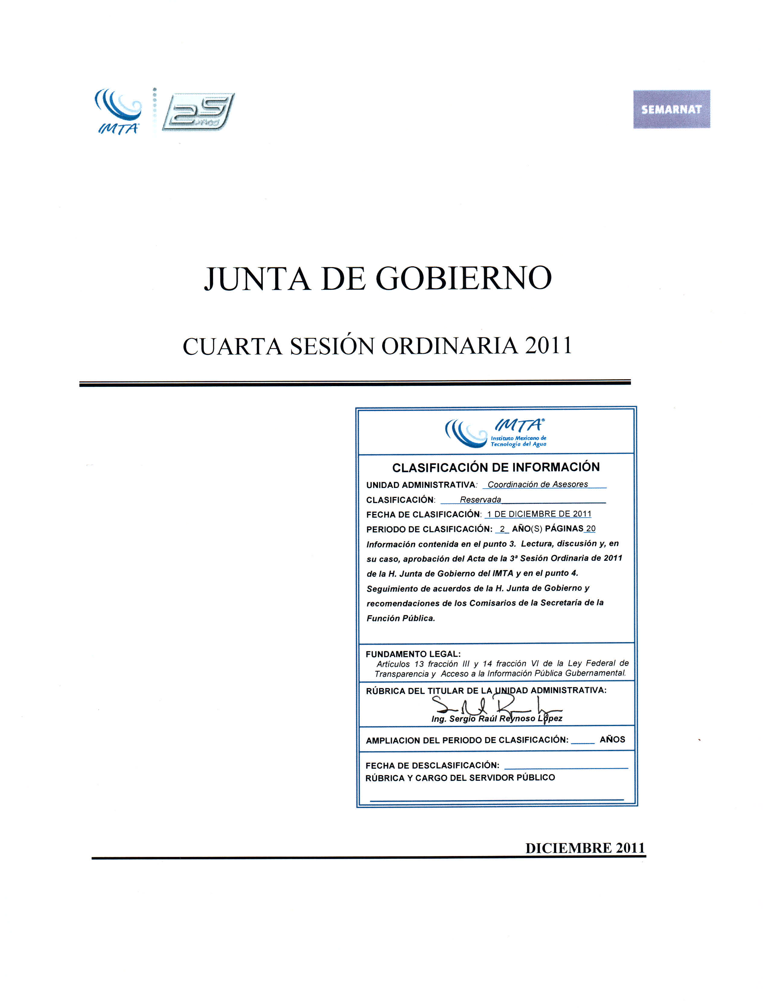 Lectura, discusión y, en su caso, aprobación del Acta de la 3ª Sesión Ordinaria de 2011 de la H. Junta de Gobierno del IMTA
